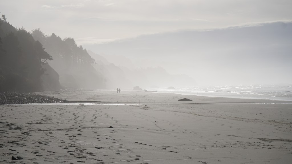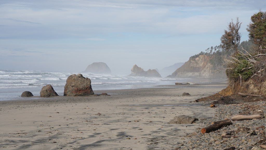 Postrzępiona linia brzegowa raz po raz odsłania przed nami bezmiar oceanu. Są to naparstki chwil, bo wijąca się droga szybko zabiera nas w zalesione zakamarki. Klifowe ściany skutecznie zasłaniają moment spotkania oceanu z lądem, można się tam wtedy udać tylko w wyobraźni. Jedak wybrzeże Oregonu to nie tylko skaliste formacje stojące na straży tej bezkresnej wody. Są tutaj też plaże – i te ukryte i maleńkie, i te szerokie i rozłożyste. Udajemy się w kierunku jednych i drugich.
